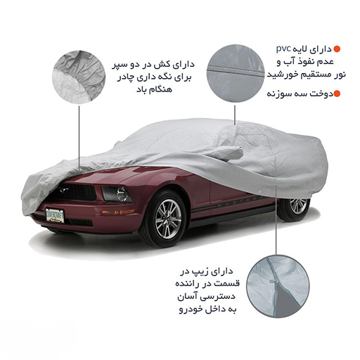 دارای لایه داخلی اسپان‌باند - دارای لایه خارجی PVC - دوخت سه‌سوزنه ضدآب - دارای زیپ سمت راننده - دارای کش در دو سر سپر - دارای جای آینه - مناسب برای همه فصول سال