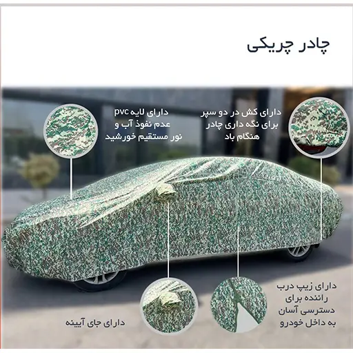 دارای لایه PVC - دارای زیپ سمت راننده - دارای کش در دو سر سپر - دارای جای آیینه - مناسب برای همه فصلها