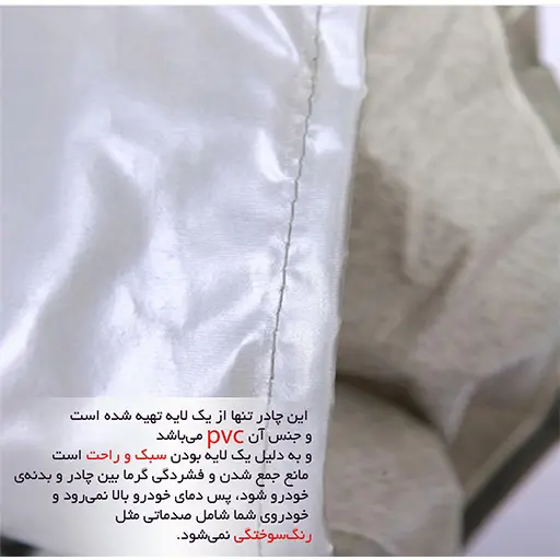 دارای لایه PVC - دارای زیپ سمت راننده - دارای کش در دو سر سپر - دارای جای آیینه
